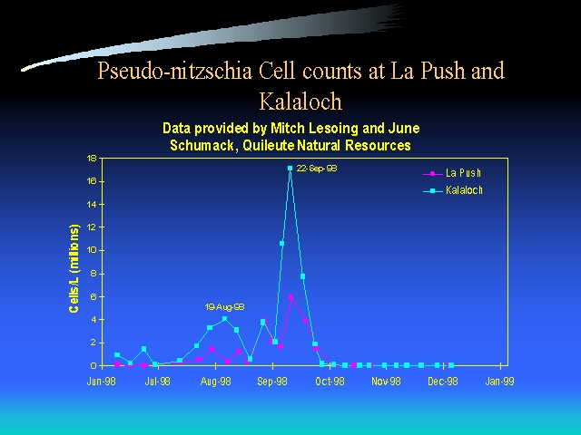 In this slide we can see that cell counts of Pseudo-nitzschia spp. were consistantly higher at Kalaloch, reaching a maximum of nearly 18 million cells per liter. The maximum was reached in mid to late September (September 22) but was apparently preceded by a smaller bloom in mid-August (August 19). Maximum Pseudo-nitzschia counts at La Push (about 40 miles north) were approximately 1/3 of the levels observed at Kalaloch. By October no traces of Pseudo-nitzschia were observed in water samples from both sites--an apparent crash of this diatom. This earlier August 19th bloom had low toxin content. These data would be consistent with the past 8 years of observation that Kalaloch beach razor clams appear to alway show some sign of domoic acid.