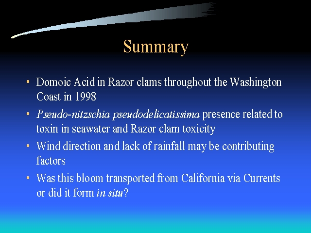 In summary, Domoic acid was detected in Razor clams throughout the Coast of Washington at various levels. The presence of P. pseudodelicatissima is related to the presence of toxin in seawater and razor clams. Winds and rainfall appear to have played a roll in the bloom.